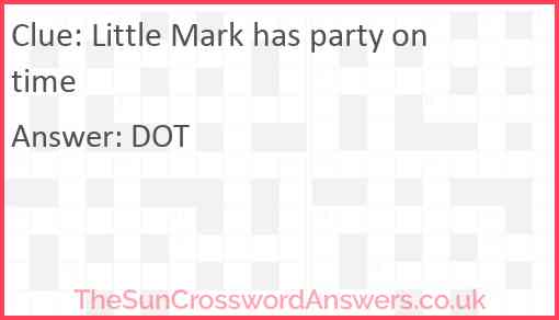 Little Mark has party on time is a crossword clue for which we have 1 possible answer and we have spotted 3 times in our database. This crossword clue was last seen on 27 May 2023 in The Sun Cryptic Crossword puzzle!
