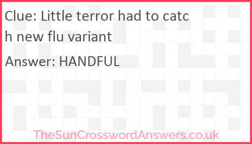 Little terror had to catch new flu variant is a crossword clue for which we have 1 possible answer and we have spotted 3 times in our database. This crossword clue was last seen on 14 December 2023 in The Sun Cryptic Crossword puzzle!