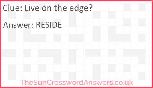 Live on the edge is a crossword clue for which we have 1 possible answer and we have spotted 5 times in our database. This crossword clue was last seen on 18 September 2024 in The Sun Cryptic Crossword puzzle!