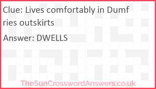 Lives comfortably in Dumfries outskirts is a crossword clue for which we have 1 possible answer and we have spotted 3 times in our database. This crossword clue was last seen on 25 June 2023 in The Sun Cryptic Crossword puzzle!
