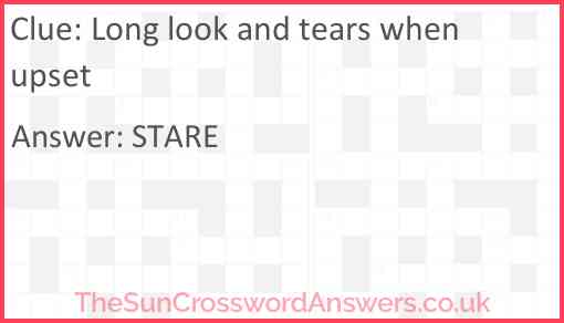 Long look and tears when upset is a crossword clue for which we have 1 possible answer and we have spotted 5 times in our database. This crossword clue was last seen on 08 October 2024 in The Sun Cryptic Crossword puzzle!