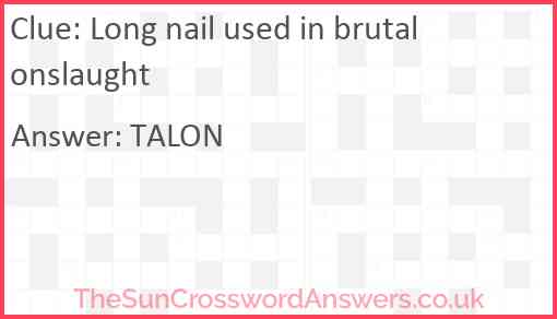 Long nail used in brutal onslaught is a crossword clue for which we have 1 possible answer and we have spotted 1 times in our database. This crossword clue was last seen on 22 March 2022 in The Sun Cryptic Crossword puzzle!
