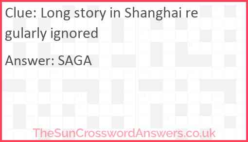 Long story in Shanghai regularly ignored is a crossword clue for which we have 1 possible answer and we have spotted 2 times in our database. This crossword clue was last seen on 28 March 2021 in The Sun Cryptic Crossword puzzle!