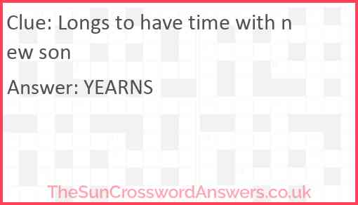 Longs to have time with new son is a crossword clue for which we have 1 possible answer and we have spotted 2 times in our database. This crossword clue was last seen on 02 April 2023 in The Sun Cryptic Crossword puzzle!