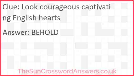 Look courageous captivating English hearts is a crossword clue for which we have 1 possible answer and we have spotted 2 times in our database. This crossword clue was last seen on 07 June 2023 in The Sun Cryptic Crossword puzzle!