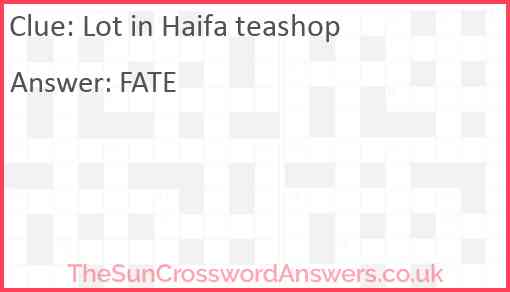 Lot in Haifa teashop is a crossword clue for which we have 1 possible answer and we have spotted 3 times in our database. This crossword clue was last seen on 22 November 2024 in The Sun Cryptic Crossword puzzle!