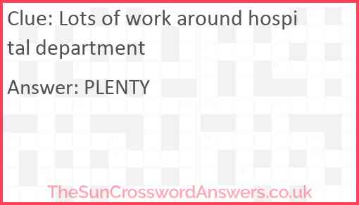 Lots of work around hospital department is a crossword clue for which we have 1 possible answer and we have spotted 1 times in our database. This crossword clue was last seen on 11 June 2023 in The Sun Cryptic Crossword puzzle!