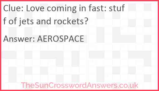 Love coming in fast: stuff of jets and rockets? is a crossword clue for which we have 1 possible answer and we have spotted 1 times in our database. This crossword clue was last seen on 12 January 2024 in The Sun Cryptic Crossword puzzle!