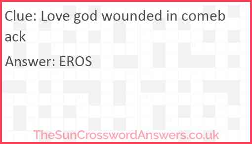Love god wounded in comeback is a crossword clue for which we have 1 possible answer and we have spotted 1 times in our database. This crossword clue was last seen on 17 December 2024 in The Sun Cryptic Crossword puzzle!