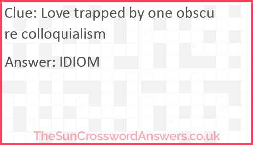 Love trapped by one obscure colloquialism is a crossword clue for which we have 1 possible answer and we have spotted 1 times in our database. This crossword clue was last seen on 07 June 2021 in The Sun Cryptic Crossword puzzle!