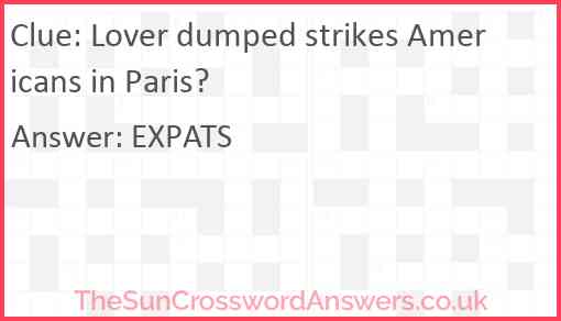 Lover dumped strikes Americans in Paris? is a crossword clue for which we have 1 possible answer and we have spotted 1 times in our database. This crossword clue was last seen on 25 November 2020 in The Sun Cryptic Crossword puzzle!