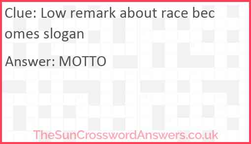 Low remark about race becomes slogan is a crossword clue for which we have 1 possible answer and we have spotted 1 times in our database. This crossword clue was last seen on 18 July 2019 in The Sun Cryptic Crossword puzzle!