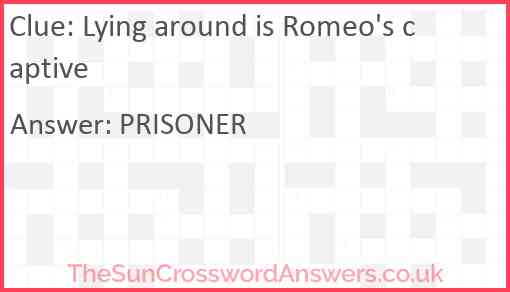 Lying around is Romeo's captive is a crossword clue for which we have 1 possible answer and we have spotted 1 times in our database. This crossword clue was last seen on 06 December 2024 in The Sun Cryptic Crossword puzzle!