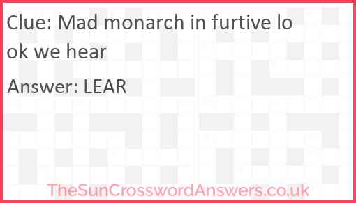 Mad monarch in furtive look we hear is a crossword clue for which we have 1 possible answer and we have spotted 1 times in our database. This crossword clue was last seen on 31 October 2021 in The Sun Cryptic Crossword puzzle!