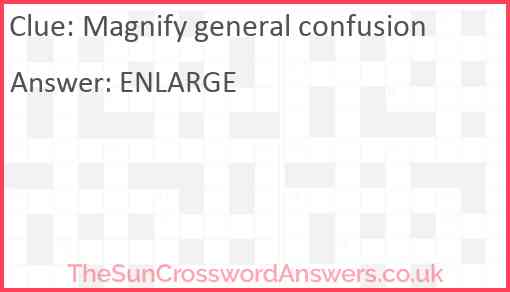 Magnify general confusion is a crossword clue for which we have 1 possible answer and we have spotted 1 times in our database. This crossword clue was last seen on 25 February 2024 in The Sun Cryptic Crossword puzzle!