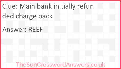 Main bank initially refunded charge back is a crossword clue for which we have 1 possible answer and we have spotted 3 times in our database. This crossword clue was last seen on 25 March 2023 in The Sun Cryptic Crossword puzzle!