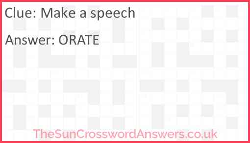 Make a speech is a crossword clue for which we have 1 possible answer and we have spotted 1 times in our database. This crossword clue was last seen on 20 September 2018 in The Sun Coffee Time Crossword puzzle!