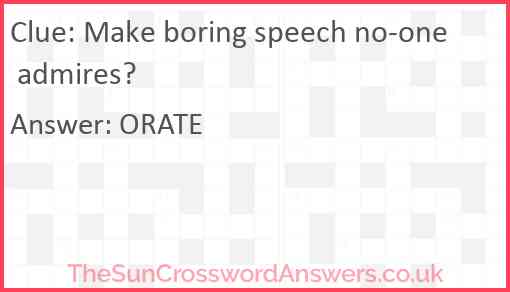 Make boring speech no-one admires? is a crossword clue for which we have 1 possible answer and we have spotted 2 times in our database. This crossword clue was last seen on 12 April 2025 in The Sun Cryptic Crossword puzzle!