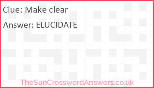Make clear is a crossword clue for which we have 1 possible answer and we have spotted 1 times in our database. This crossword clue was last seen on 01 June 2022 in The Sun Coffee Time Crossword puzzle!