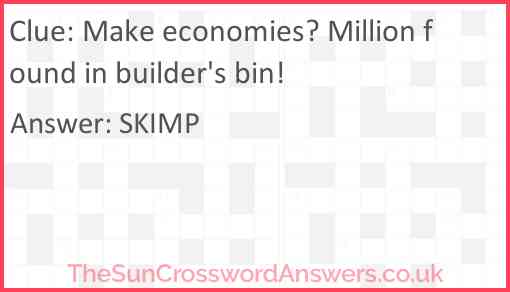 Make economies? Million found in builder's bin! is a crossword clue for which we have 1 possible answer and we have spotted 2 times in our database. This crossword clue was last seen on 24 March 2024 in The Sun Cryptic Crossword puzzle!