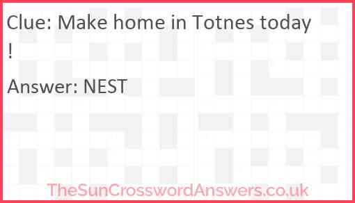 Make home in Totnes today! is a crossword clue for which we have 1 possible answer and we have spotted 3 times in our database. This crossword clue was last seen on 02 March 2025 in The Sun Cryptic Crossword puzzle!