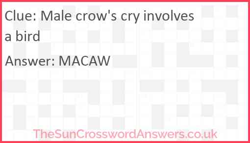 Male crow's cry involves a bird is a crossword clue for which we have 1 possible answer and we have spotted 3 times in our database. This crossword clue was last seen on 22 December 2024 in The Sun Cryptic Crossword puzzle!