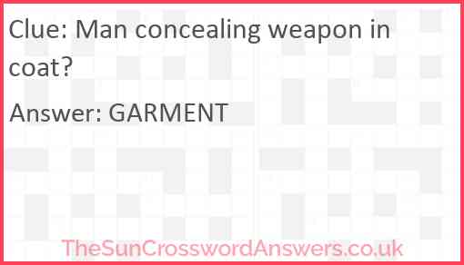 Man concealing weapon in coat? is a crossword clue for which we have 1 possible answer and we have spotted 2 times in our database. This crossword clue was last seen on 29 December 2022 in The Sun Cryptic Crossword puzzle!