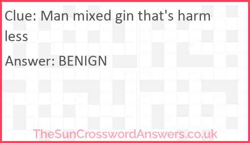 Man mixed gin that's harmless is a crossword clue for which we have 1 possible answer and we have spotted 2 times in our database. This crossword clue was last seen on 30 November 2022 in The Sun Cryptic Crossword puzzle!