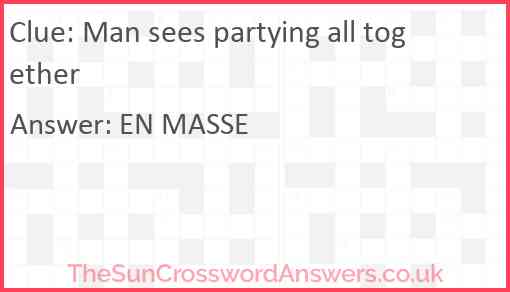 Man sees partying all together is a crossword clue for which we have 2 possible answer and we have spotted 2 times in our database. This crossword clue was last seen on 09 January 2024 in The Sun Cryptic Crossword puzzle!