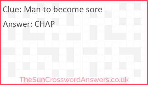 Man to become sore is a crossword clue for which we have 1 possible answer and we have spotted 2 times in our database. This crossword clue was last seen on 16 June 2023 in The Sun Cryptic Crossword puzzle!