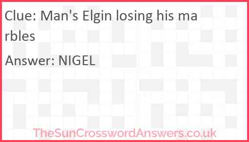Man's Elgin losing his marbles is a crossword clue for which we have 1 possible answer and we have spotted 1 times in our database. This crossword clue was last seen on 11 April 2024 in The Sun Cryptic Crossword puzzle!