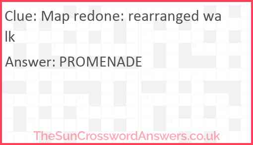 Map redone: rearranged walk is a crossword clue for which we have 1 possible answer and we have spotted 1 times in our database. This crossword clue was last seen on 21 July 2022 in The Sun Cryptic Crossword puzzle!