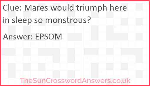 Mares would triumph here in sleep so monstrous? is a crossword clue for which we have 1 possible answer and we have spotted 1 times in our database. This crossword clue was last seen on 23 June 2024 in The Sun Cryptic Crossword puzzle!