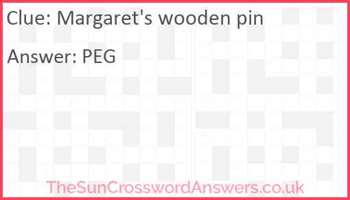 Margaret's wooden pin is a crossword clue for which we have 1 possible answer and we have spotted 1 times in our database. This crossword clue was last seen on 19 July 2020 in The Sun Cryptic Crossword puzzle!
