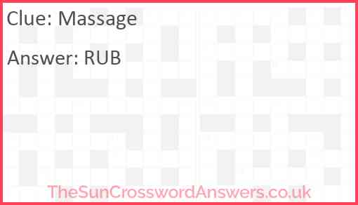 Massage is a crossword clue for which we have 1 possible answer and we have spotted 1 times in our database. This crossword clue was last seen on 18 January 2025 in The Sun Coffee Time Crossword puzzle!