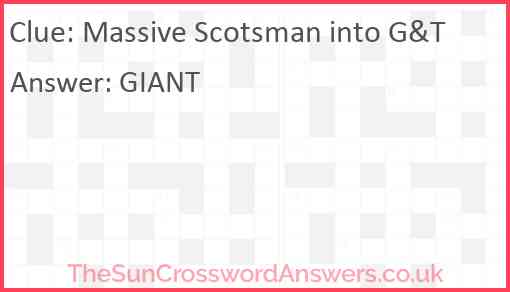Massive Scotsman into G&T is a crossword clue for which we have 1 possible answer and we have spotted 3 times in our database. This crossword clue was last seen on 31 March 2025 in The Sun Cryptic Crossword puzzle!