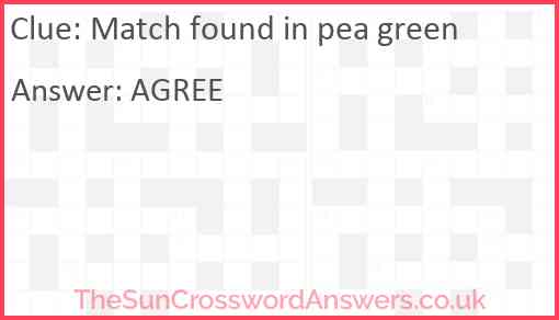 Match found in pea green is a crossword clue for which we have 1 possible answer and we have spotted 5 times in our database. This crossword clue was last seen on 16 January 2025 in The Sun Cryptic Crossword puzzle!
