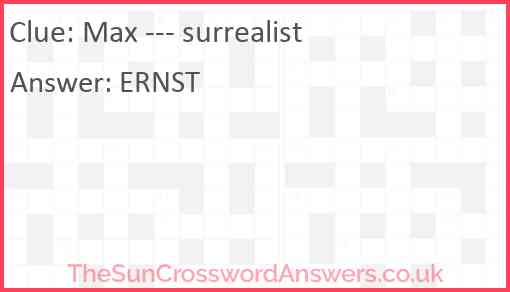 Max --- surrealist is a crossword clue for which we have 1 possible answer and we have spotted 3 times in our database. This crossword clue was last seen on 09 March 2020 in The Sun Coffee Time Crossword puzzle!