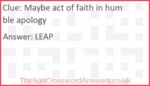 Maybe act of faith in humble apology is a crossword clue for which we have 1 possible answer and we have spotted 2 times in our database. This crossword clue was last seen on 02 February 2025 in The Sun Cryptic Crossword puzzle!