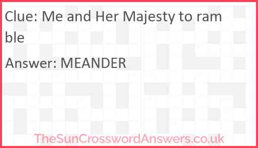 Me and Her Majesty to ramble is a crossword clue for which we have 1 possible answer and we have spotted 1 times in our database. This crossword clue was last seen on 11 June 2022 in The Sun Cryptic Crossword puzzle!