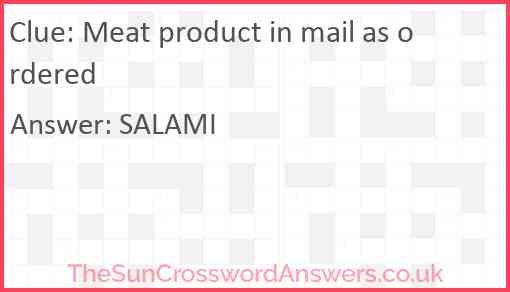Meat product in mail as ordered is a crossword clue for which we have 1 possible answer and we have spotted 2 times in our database. This crossword clue was last seen on 01 June 2022 in The Sun Cryptic Crossword puzzle!