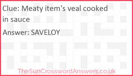 Meaty item's veal cooked in sauce is a crossword clue for which we have 1 possible answer and we have spotted 2 times in our database. This crossword clue was last seen on 27 April 2023 in The Sun Cryptic Crossword puzzle!