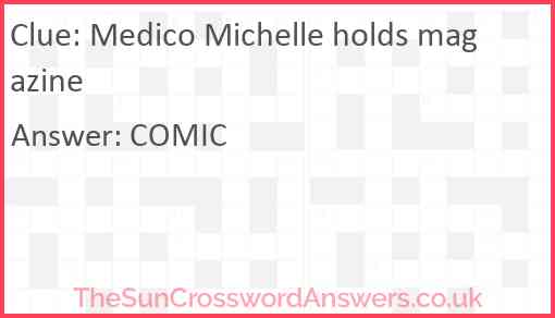 Medico Michelle holds magazine is a crossword clue for which we have 1 possible answer and we have spotted 1 times in our database. This crossword clue was last seen on 09 November 2022 in The Sun Cryptic Crossword puzzle!