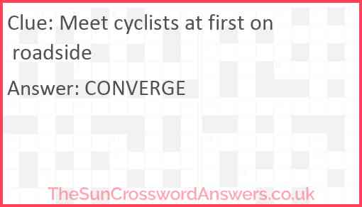 Meet cyclists at first on roadside is a crossword clue for which we have 1 possible answer and we have spotted 2 times in our database. This crossword clue was last seen on 12 December 2022 in The Sun Cryptic Crossword puzzle!
