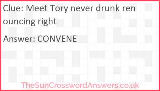 Meet Tory never drunk renouncing right is a crossword clue for which we have 1 possible answer and we have spotted 1 times in our database. This crossword clue was last seen on 06 September 2024 in The Sun Cryptic Crossword puzzle!