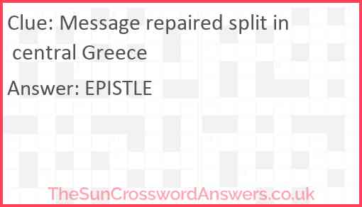 Message repaired split in central Greece is a crossword clue for which we have 1 possible answer and we have spotted 3 times in our database. This crossword clue was last seen on 26 December 2022 in The Sun Cryptic Crossword puzzle!