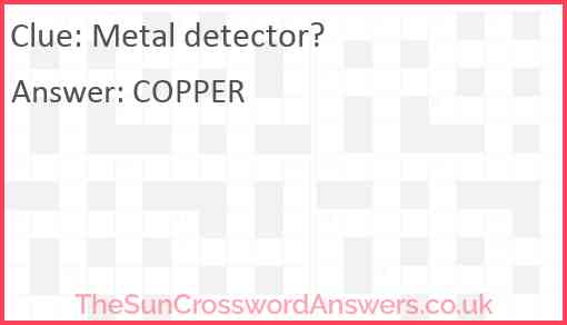 Metal detector? is a crossword clue for which we have 1 possible answer and we have spotted 2 times in our database. This crossword clue was last seen on 05 December 2022 in The Sun Cryptic Crossword puzzle!