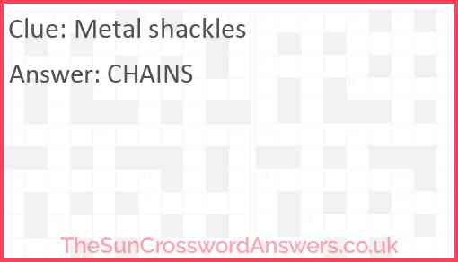 Metal shackles is a crossword clue for which we have 1 possible answer and we have spotted 1 times in our database. This crossword clue was last seen on 16 June 2024 in The Sun Coffee Time Crossword puzzle!