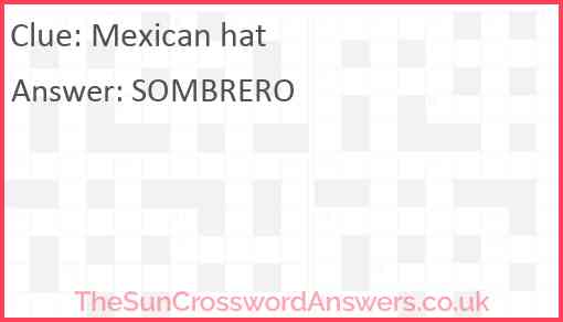 Mexican hat is a crossword clue for which we have 1 possible answer and we have spotted 2 times in our database. This crossword clue was last seen on 18 March 2025 in The Sun Coffee Time Crossword puzzle!