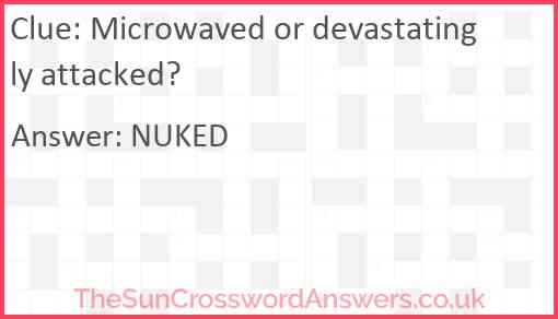 Microwaved or devastatingly attacked? is a crossword clue for which we have 1 possible answer and we have spotted 2 times in our database. This crossword clue was last seen on 22 January 2023 in The Sun Cryptic Crossword puzzle!